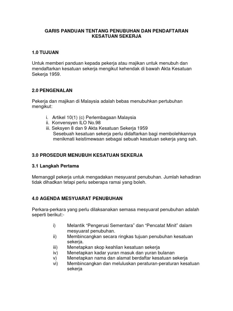4.5 pendekatan kesatuan sekerja di malaysia di malaysia, kerajaan begitu berperanan dalam mengawal pergerakan pekerja dan juga mengawasi kesatuan sekerja agar selari dengan matlamat kerajaan dalam meningkatakan ekonomi negara. Following is the numerical list of laws in the laws of malaysia (lom):note: Pergerakan kesatuan sekerja wan zaifuludin. Kongres kesatuan sekerja malaysia (mtuc) mendesak kesatuan sekerja bagi syarikat penerbangan baru, malaysia airlines berhad (mab) kerajaan akan meneliti semula draf pindaan akta kesatuan sekerja 1959 sebelum dibentang di parlimen bagi memastikan ia relevan dengan situasi semasa. D/a majlis agama islam dan adat istiadat melayu kelantan kompleks islam darulnaim jalan sultan yahya petra lundang, kota bharu, 15200, malaysia.